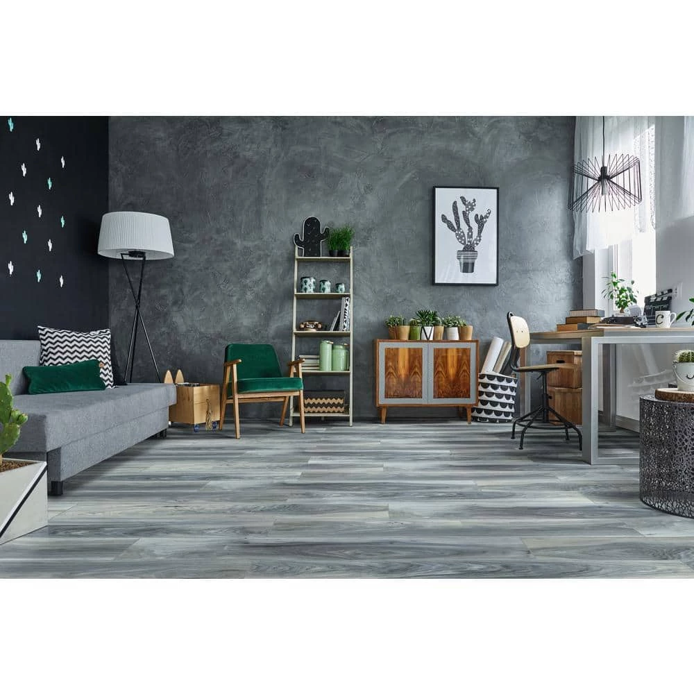 Enhance your interior design with this 7 in. x 48 in. MSI Peyor Blue Rigid Core Luxury vinyl tile flooring. Pairing with a variety of decorating schemes, this elegant flooring offers the authentic appearance of wood floors. This low-maintenance vinyl plank features a sophisticated blue and grey tones that have light knots and graining for a real wood look. It measures 5 mm. thick and is waterproof, scratch-resistant, stain-resistant and dent-resistant. This flooring is easy to install with its uni-click locking system making it DIY-friendly and it gives supreme comfort when under foot. Install in any level of your home over concrete, cork, tile or wood. Coordinating vinyl flooring trim pieces including end caps, stair noses, reducers and T-moldings are available to give your residential indoor flooring project a professional, seamless finish. This tile is suitable for installation over many subfloor surfaces.